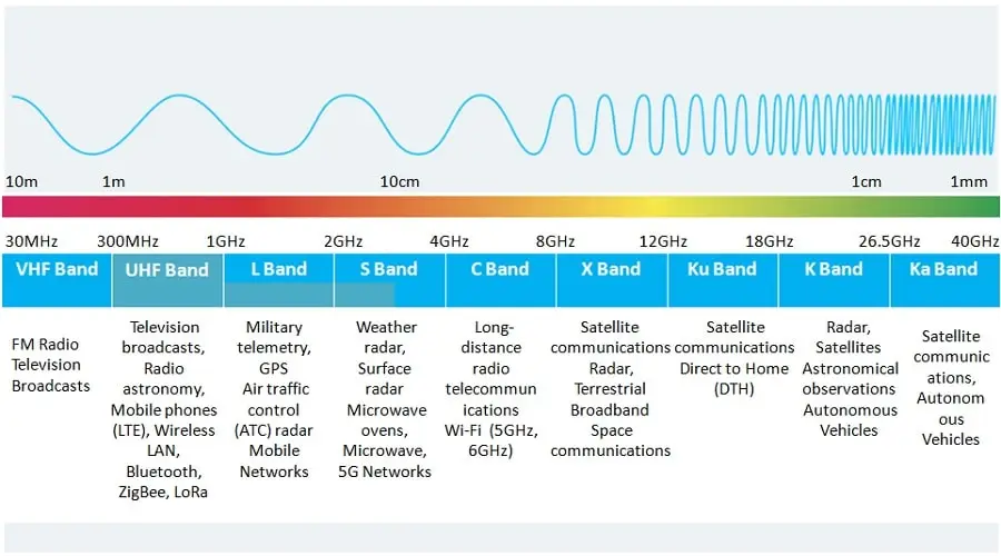 Microwaves refer to the range of electromagnetic waves with frequencies from 300MHz to 300GHz, and their corresponding wavelengths range from 1mm to 1m. The electromagnetic spectrum includes three frequency bands: decimeter waves (frequency range: 300MHz - 3GHz), centimeter waves (frequency range: 3 - 30GHz), and millimeter waves (frequency range: 30 - 300GHz). The relationship between wavelength and frequency is expressed by the formula c = λf, where c is the speed of light, λ is the wavelength, and f is the frequency.