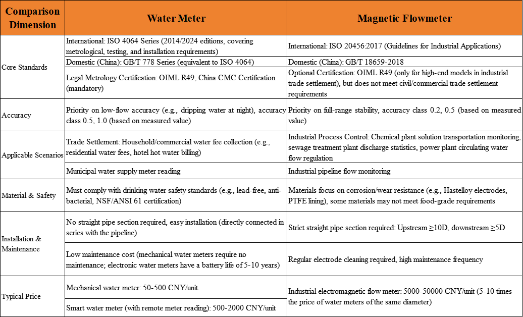 Water meters and magnetic flowmeters differ significantly in terms of measurement principles, application scenarios, and accuracy performance. The following table provides an intuitive comparison to help you quickly clarify their differences and select the right one based on your actual needs.
